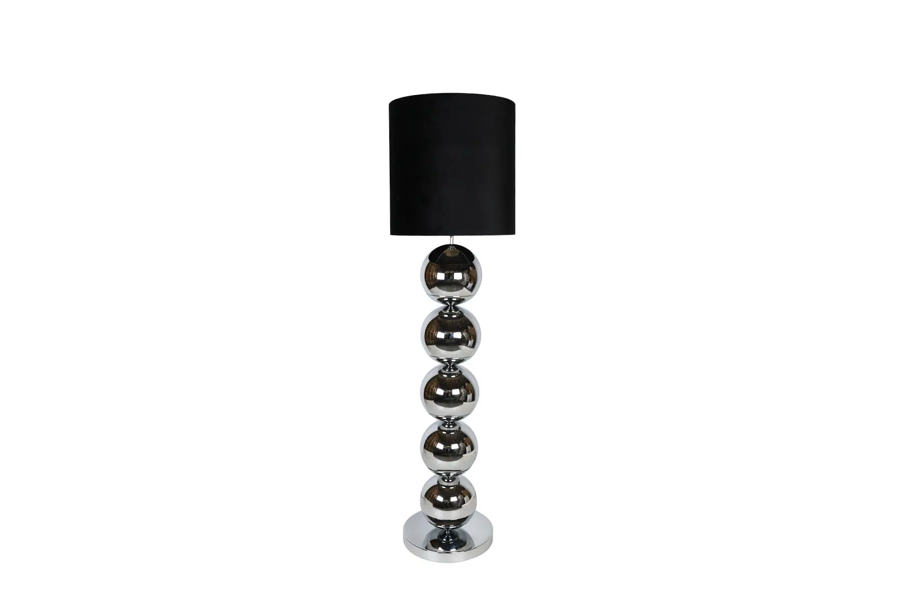 Vloerlamp met 5 bollen in de kleur chroom met zwarte kap en E27 fitting. De prijs is inclusief kap (zolang de voorraad strekt) en exclusief lampje. Afmeting: 150x49x47cm (zonder kap).